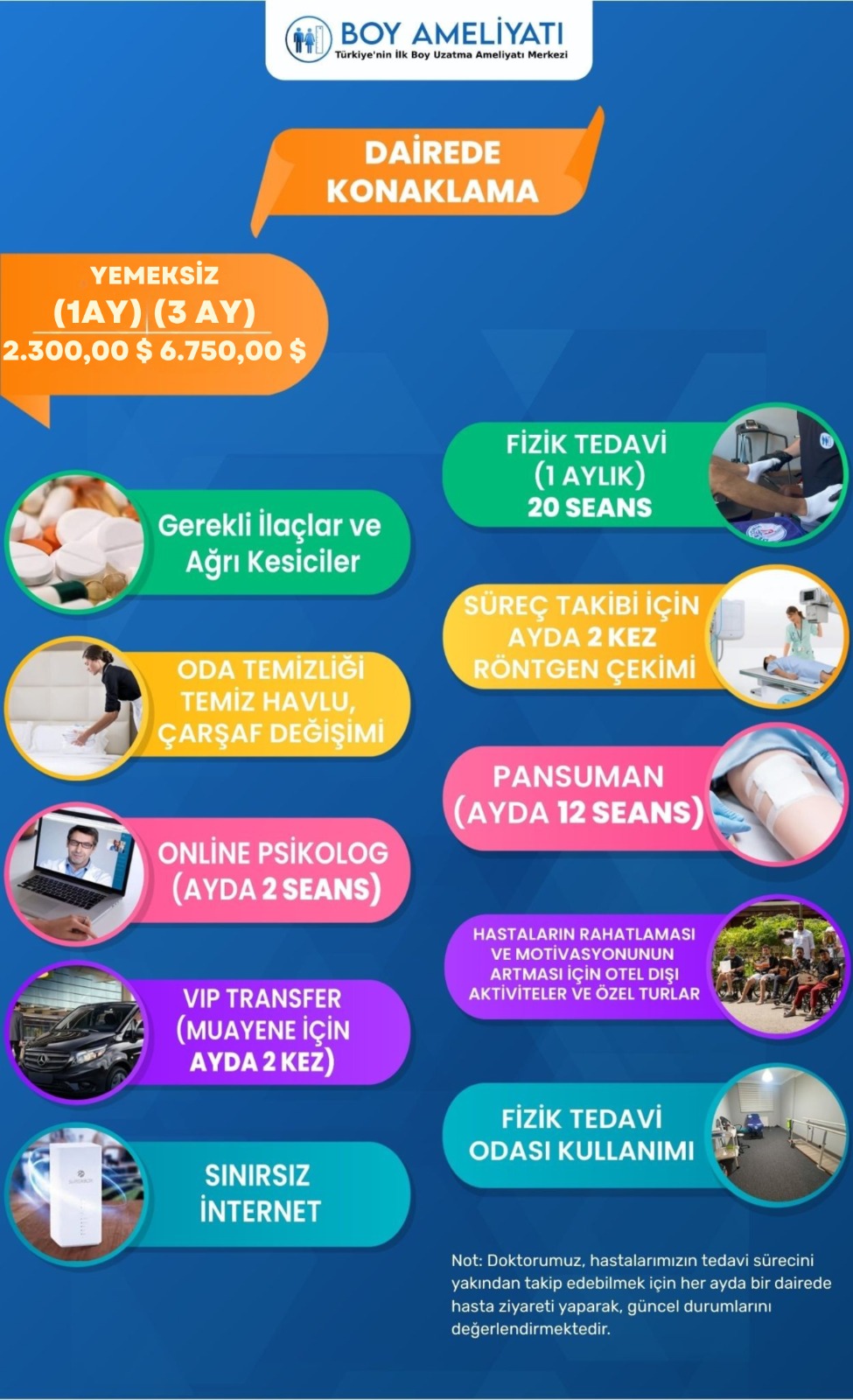 Boy Ameliyatı® ekibi olarak, boy uzatma süreciniz boyunca size en iyi olanakları ve bakımı sunmak için çalışıyoruz. İstanbul’a gelişinizden hedeflediğiniz boya ulaşana kadar, her aşamada yanınızdayız. Havalimanına varışınızdan itibaren, otel ve hastane transferlerinize kadar tüm ihtiyaçlarınızı karşılıyor ve size rahat bir ortam sunuyoruz.